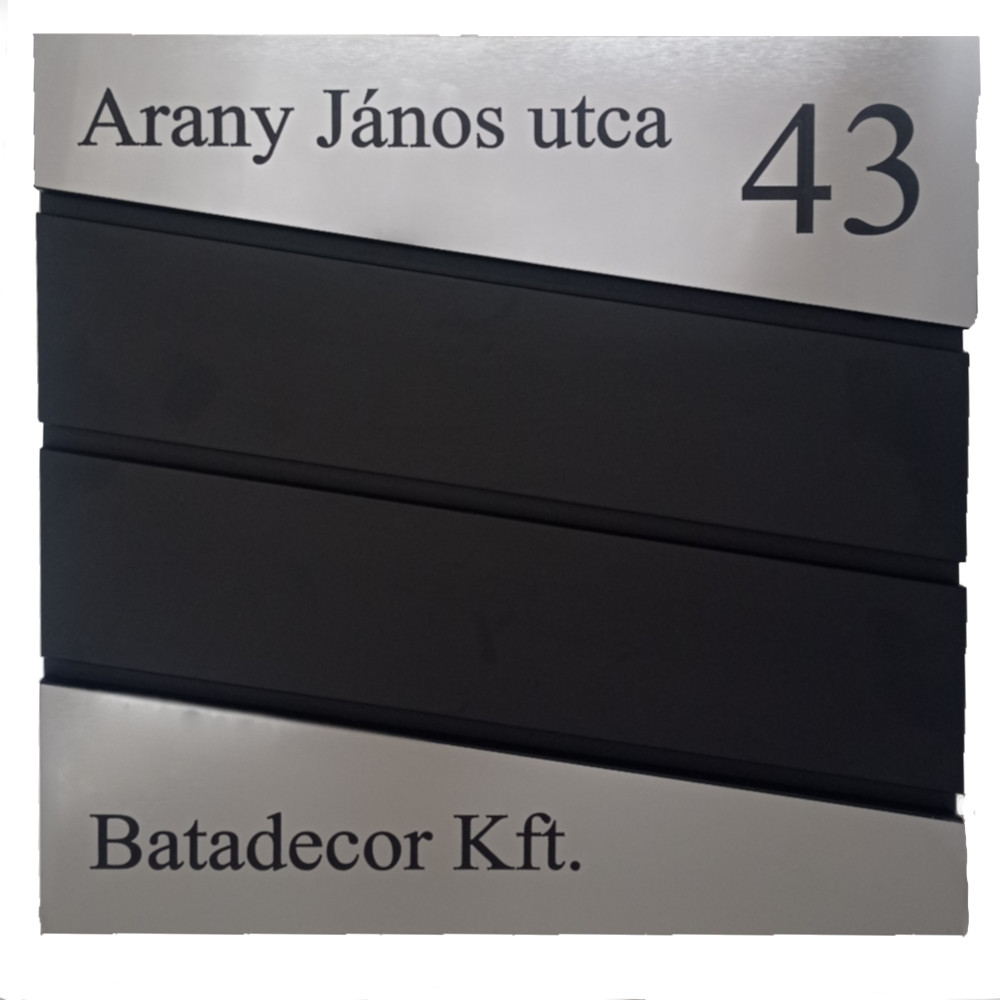 A felirat gravírozással készül kültéri műanyag lapra (az előlap színe matt ezüst, a felirat pedig fekete), melyet a postaládára ragasztunk.