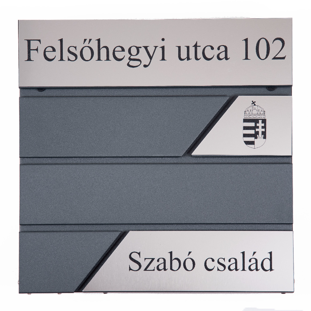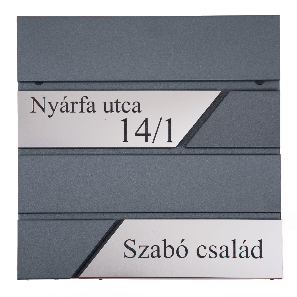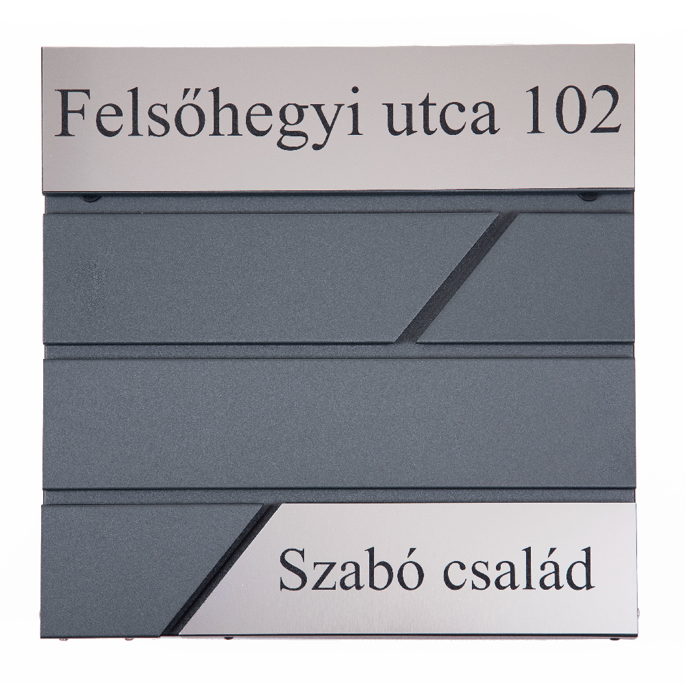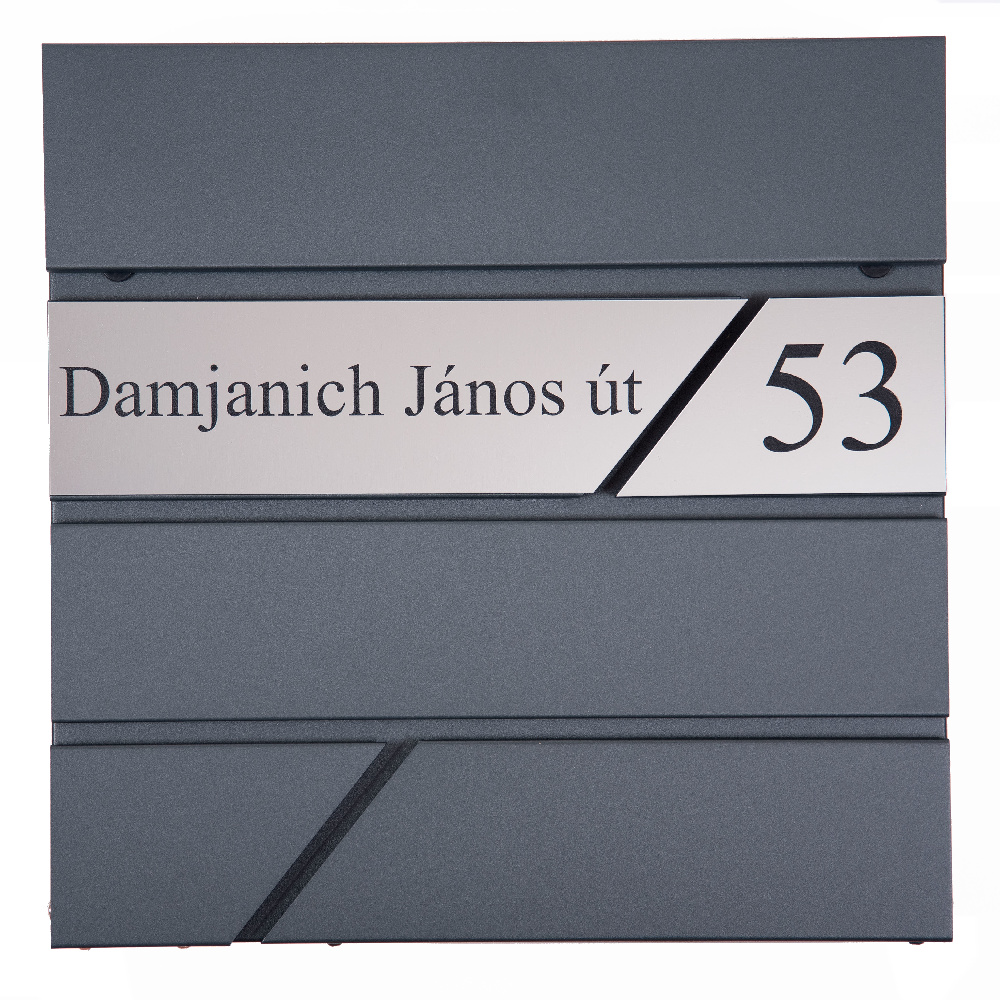 A felirat gravírozással készül kültéri műanyag lapra (az előlap színe matt ezüst, a felirat pedig fekete), melyet a postaládára ragasztunk.