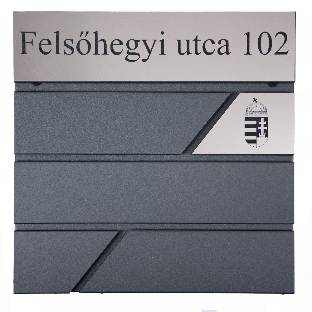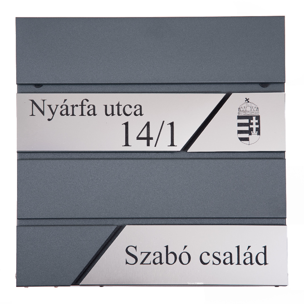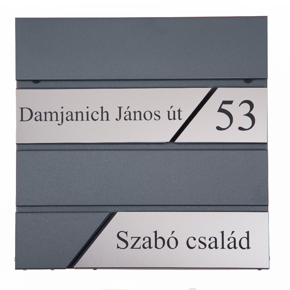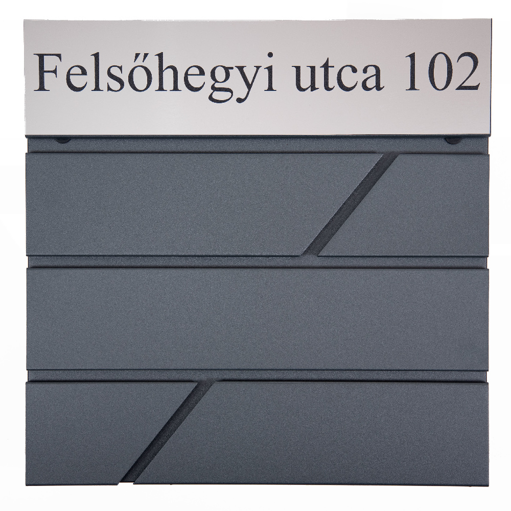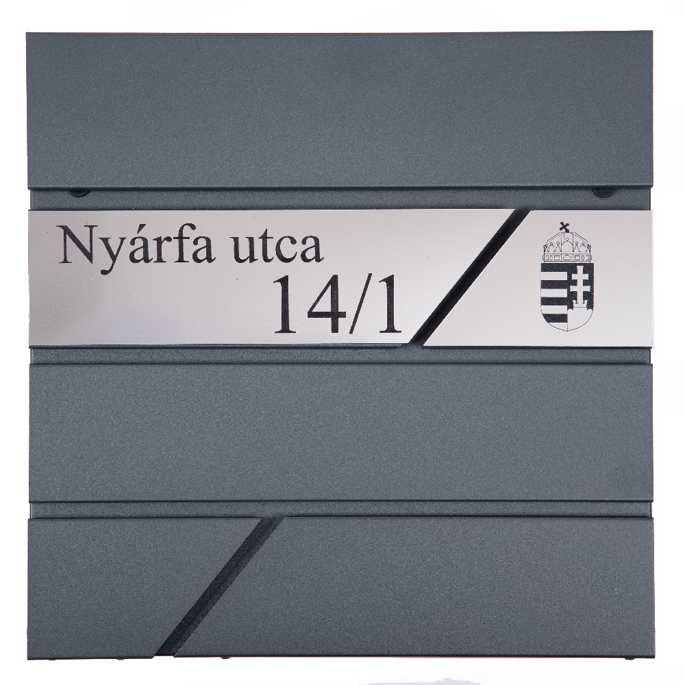 A felirat gravírozással készül kültéri műanyag lapra (az előlap színe matt ezüst, a felirat pedig fekete), melyet a postaládára ragasztunk.